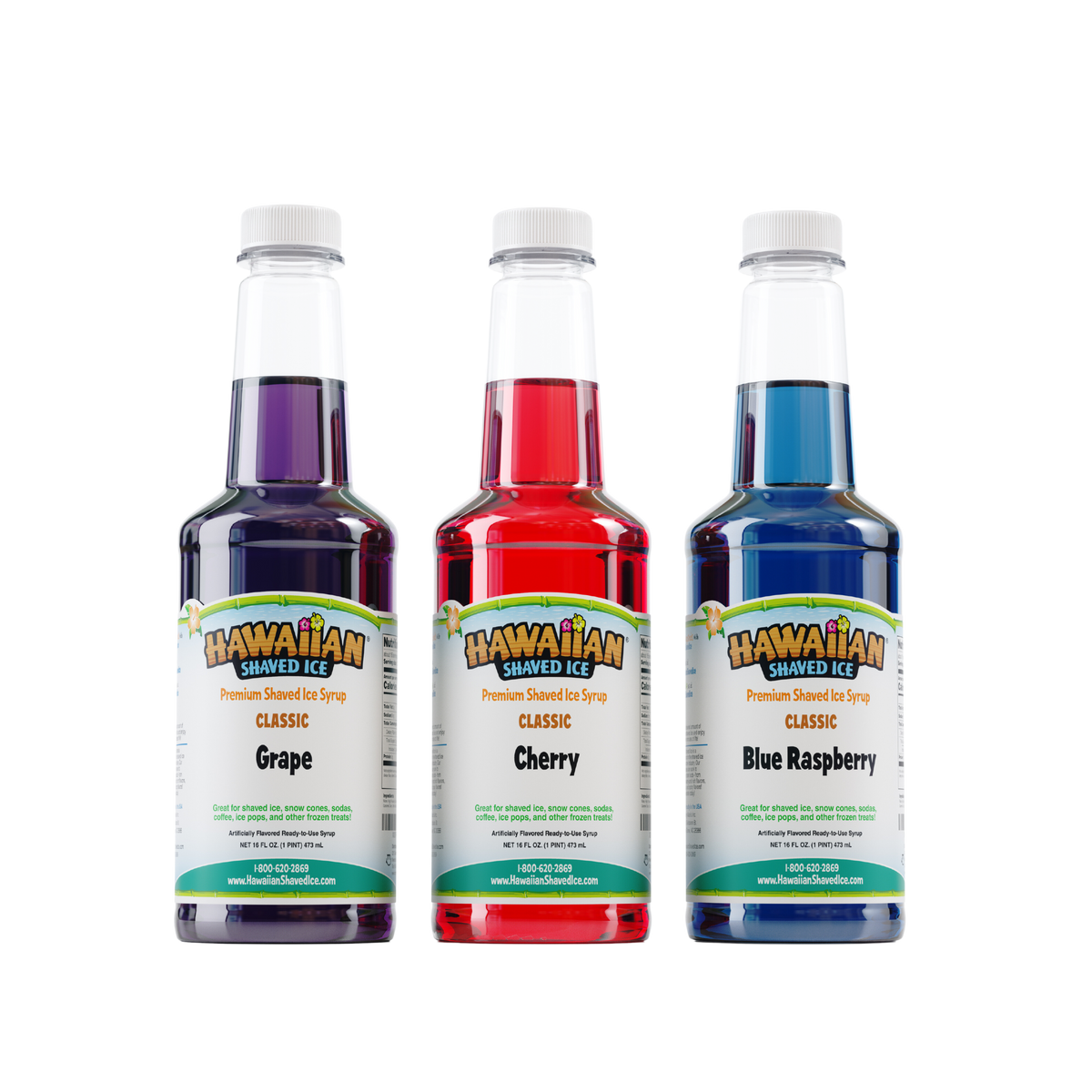 These three shaved ice syrup flavors have always been customer favorites, and now they're available in convenient 16-ounce pint bottles! The classic, fruity flavors of cherry, blue raspberry, and grape appeal to shaved ice lovers of all ages—even those with the pickiest palates.