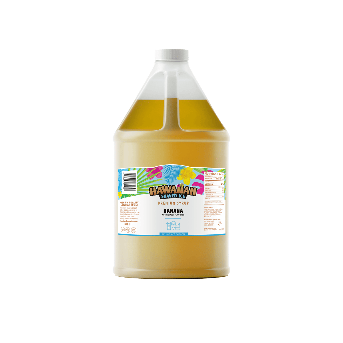 Grab a gallon of banana-flavored snow cone syrup today and monkey around with the crowd at your next party or family gathering. This yummy syrup is a definite crowd-pleaser; serve these up and have a blast! This flavor is also available in a quart and pint sizes, or you can combine it with other delicious Hawaiian Shaved Ice® flavors in a variety pack.