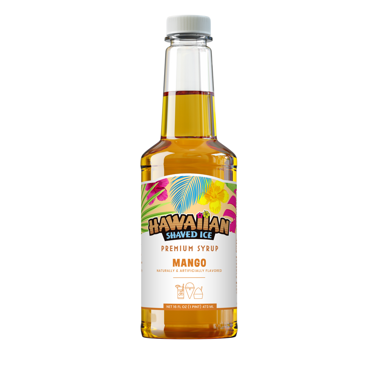 One pint of Hawaiian Shaved Ice's Mango snow cone syrup contains 16-ounces of yellow-green syrup. Once you find out how much everyone loves the mango flavor, you'll want to stock up and order a quart or even a gallon!